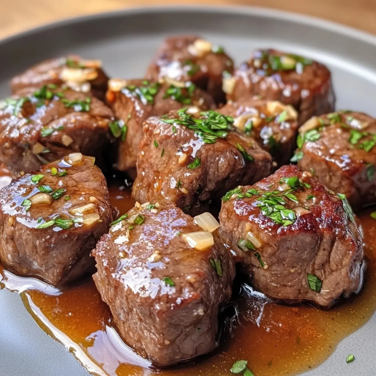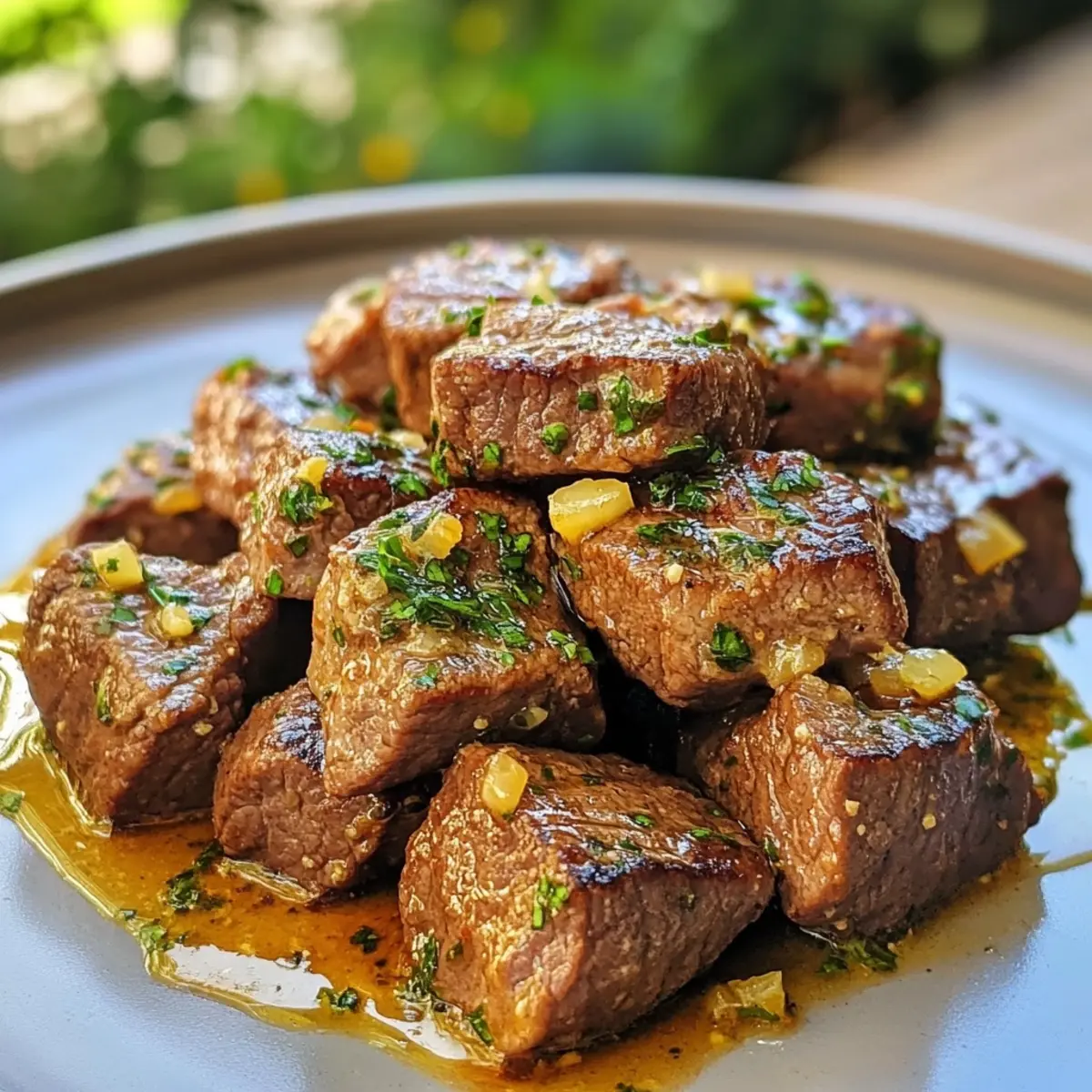 - Plate the garlic butter steak bites and garnish with freshly chopped parsley.