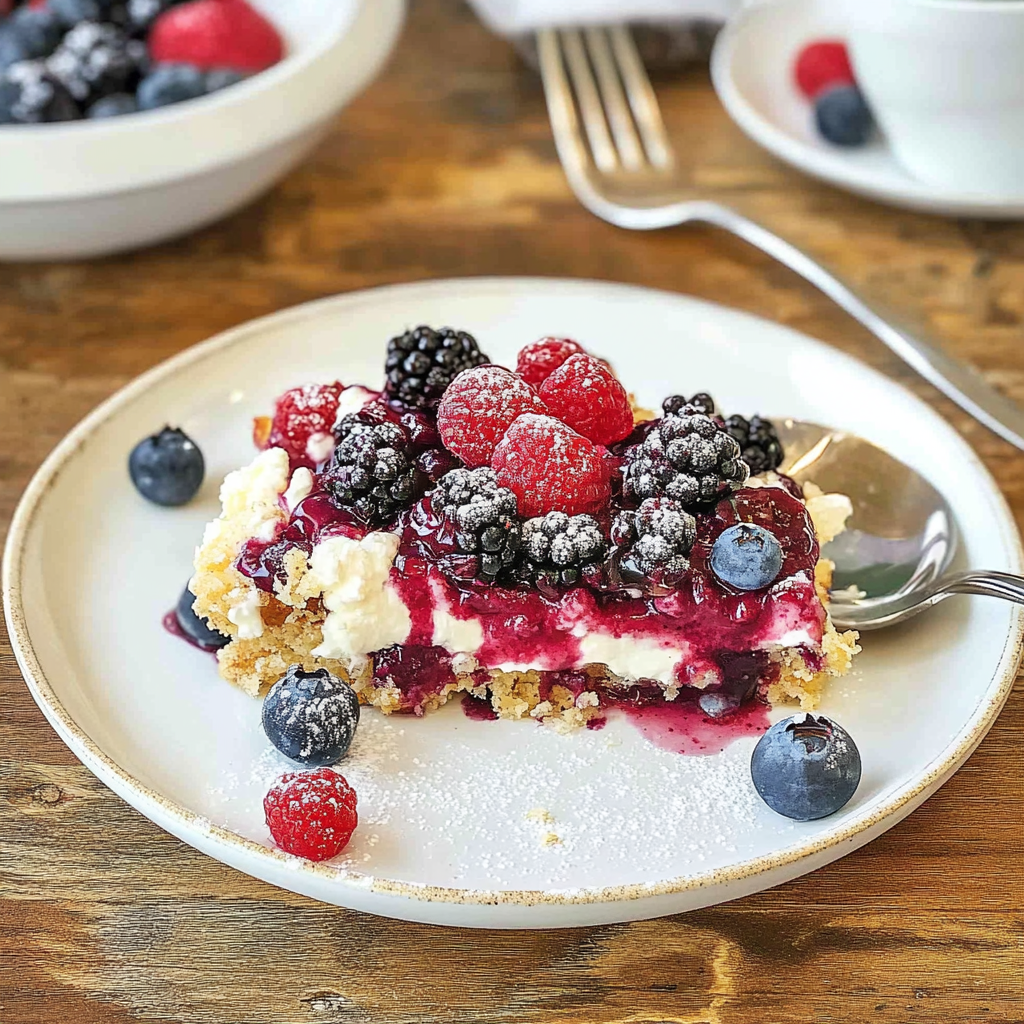 - It combines juicy berries with a buttery cake topping, creating a dessert that looks as good as it tastes.