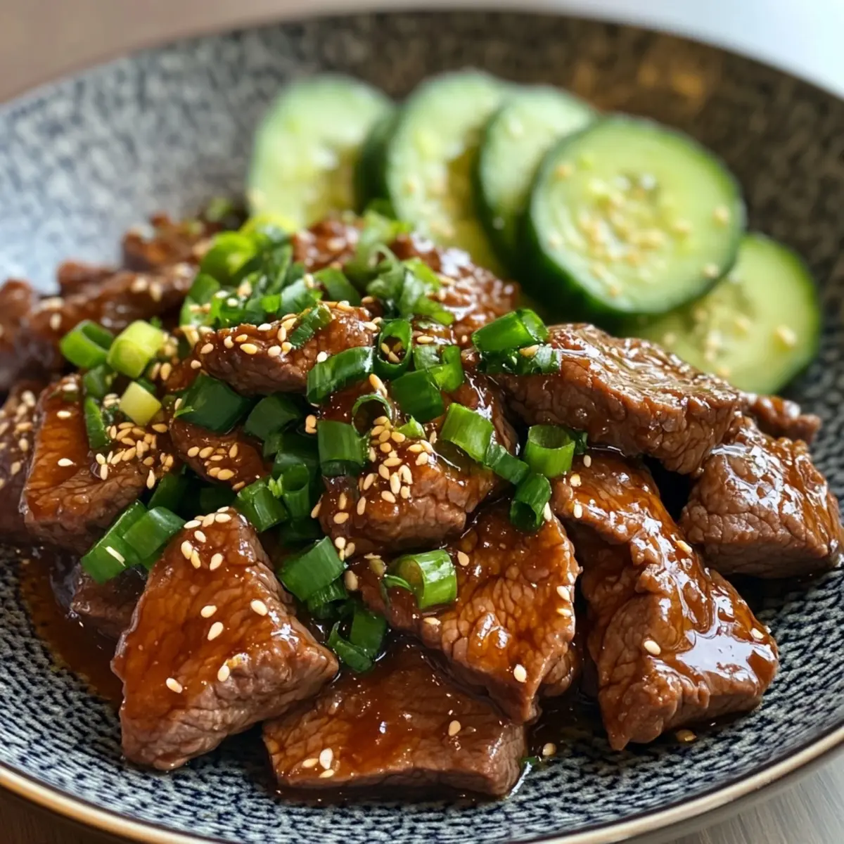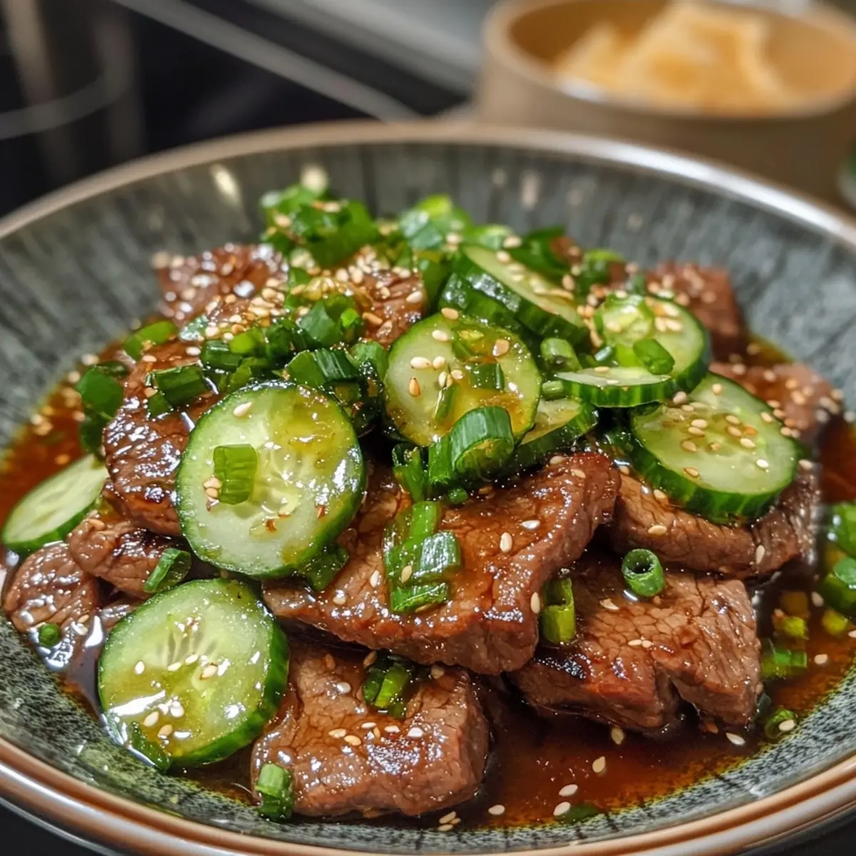 - Serve: Spoon the spicy beef mixture generously over the cucumber salad. For an extra touch, garnish with additional sesame seeds and green onions to enhance both presentation and flavor.