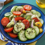 Marinated Cucumbers, Onions, and Tomatoes is a refreshing dish that combines fresh vegetables with a tangy marinade. The cucumbers provide crunch, while onions add zest and tomatoes offer sweetness. This dish is perfect as a side for grilled meats or as a light salad. The marinade typically includes vinegar, oil, herbs, and spices, enhancing the natural flavors of the vegetables. It’s an easy-to-make recipe that can be prepared ahead of time for gatherings or everyday meals.