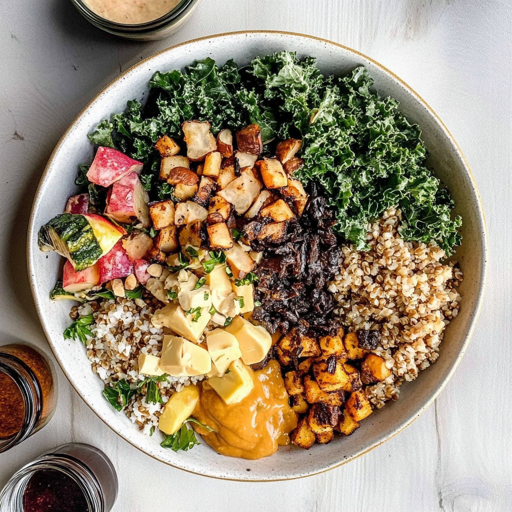 autumn dishes / comfort food / grain bowl / healthy meals / kale recipe / roasted veggies / seasonal ingredients / vegetarian bowl