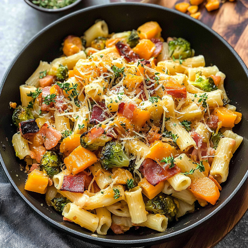 Irresistible Bacon, Brussels Sprouts, Butternut Squash Pasta