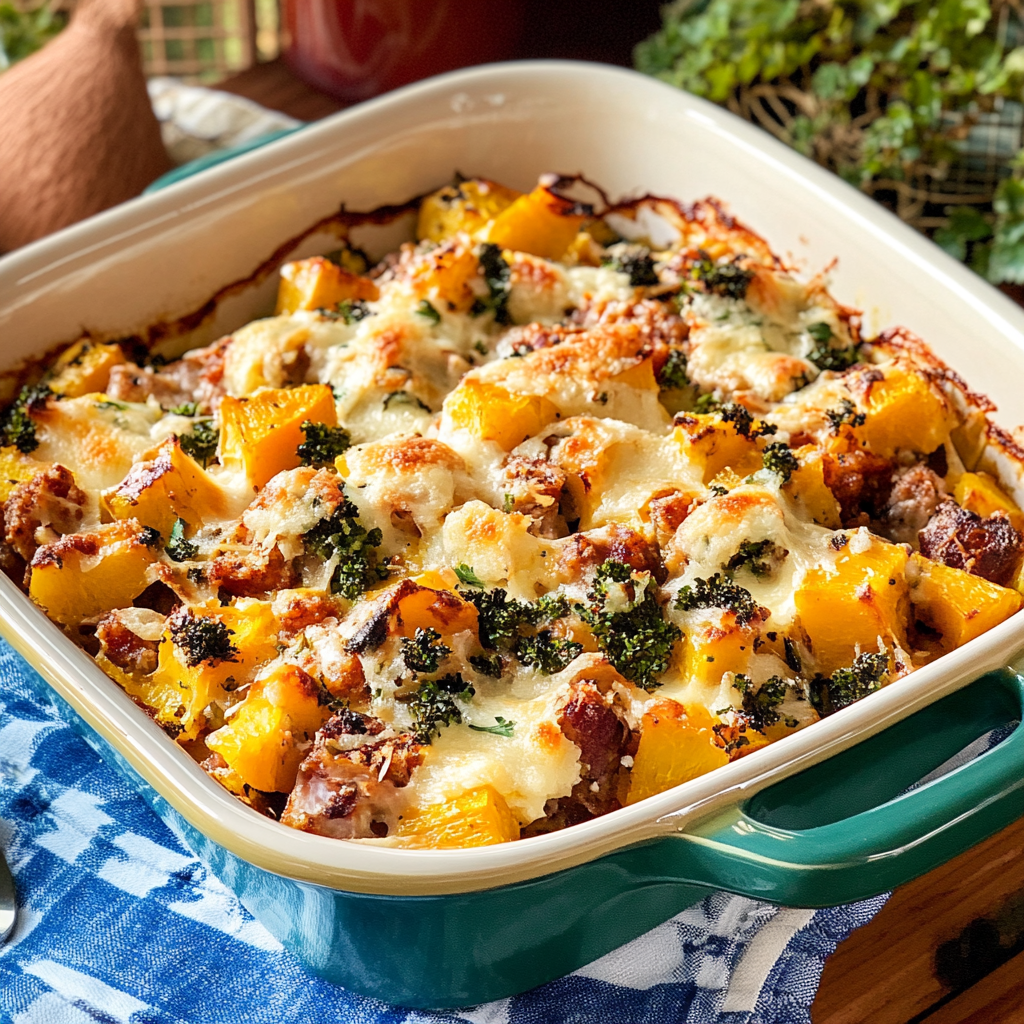 butternut squash / comfort food / cozy recipes / fall dishes / family dinner / hearty meals / sausage casserole