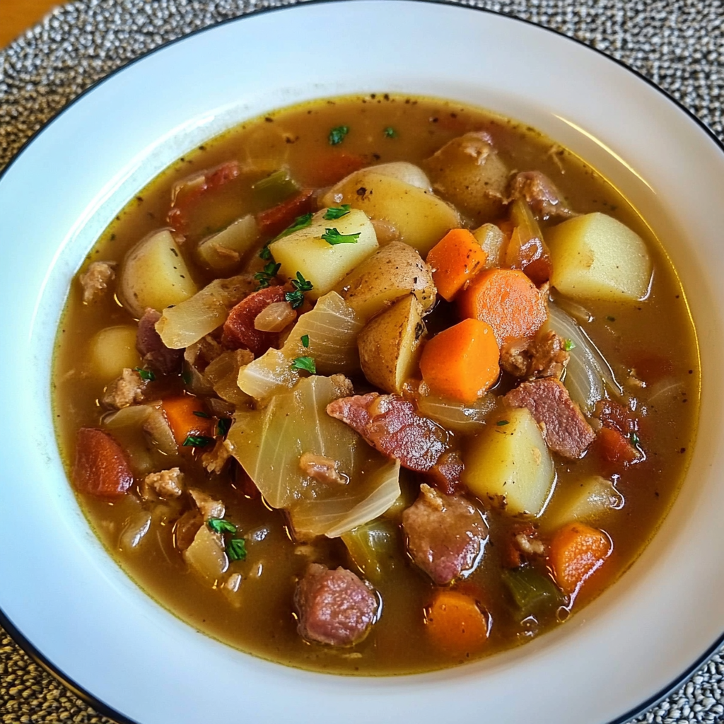 beef bacon / cabbage recipe / comfort food / cozy meals / hearty dishes / Irish soup / potato soup / savory broth